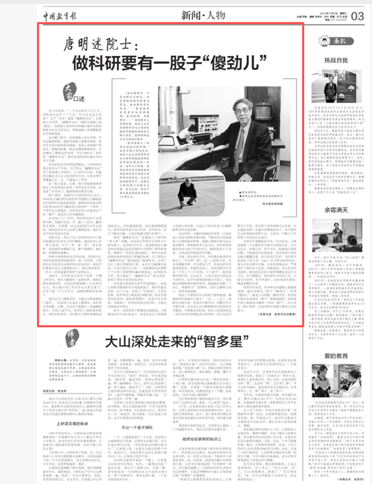 2025年11月4日,《中国教育报》新闻·人物版以《唐明述院士:做科研要有一股子“傻劲儿”》为题,重点报道了中国工程院院士、我校唐明述教授“用混凝土一样坚定的意志做科研”的执着信念和感人事迹。