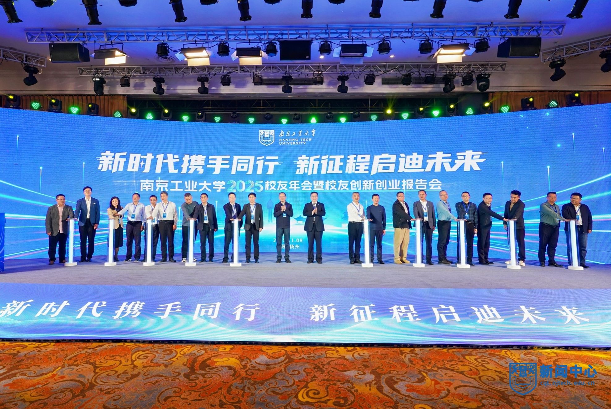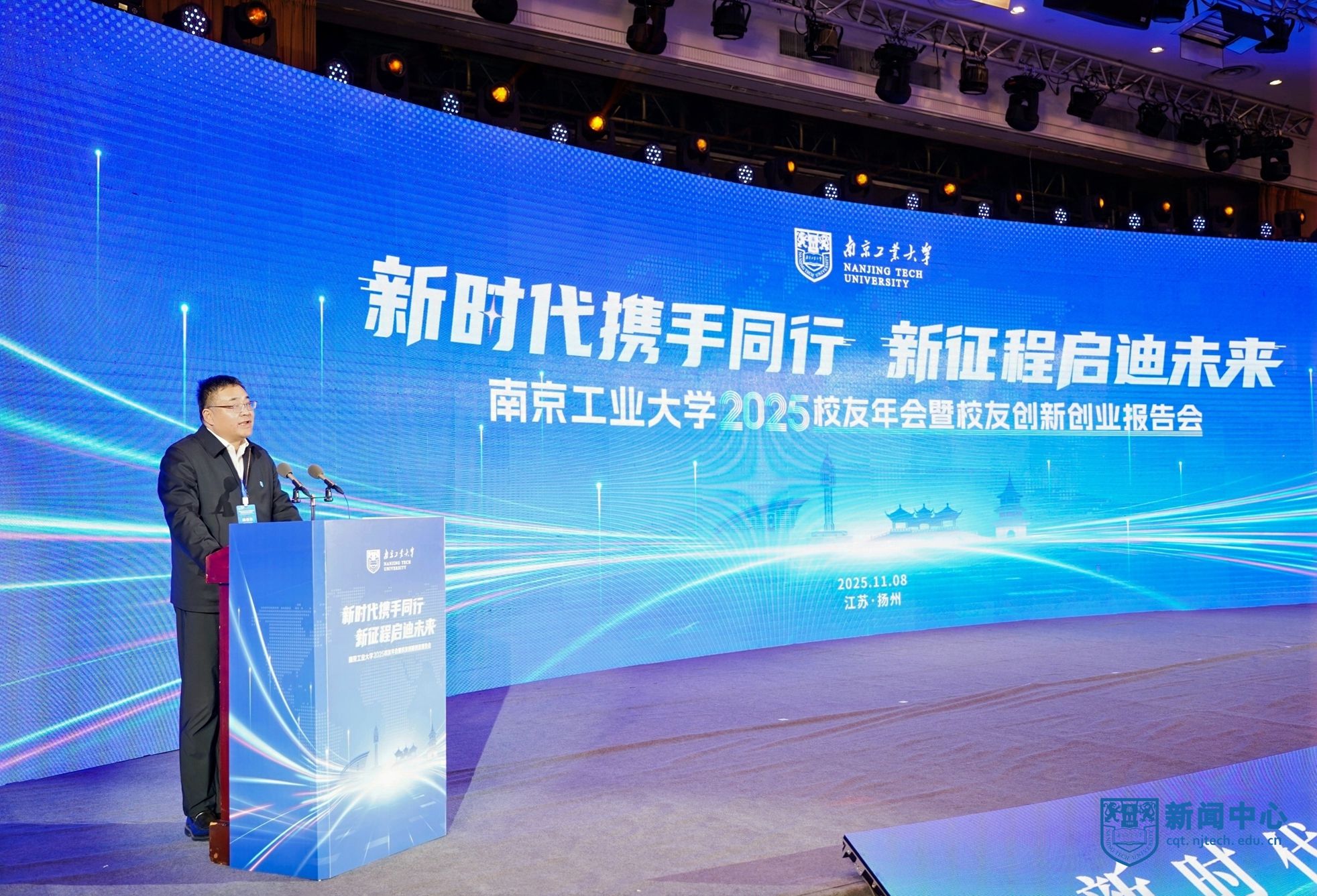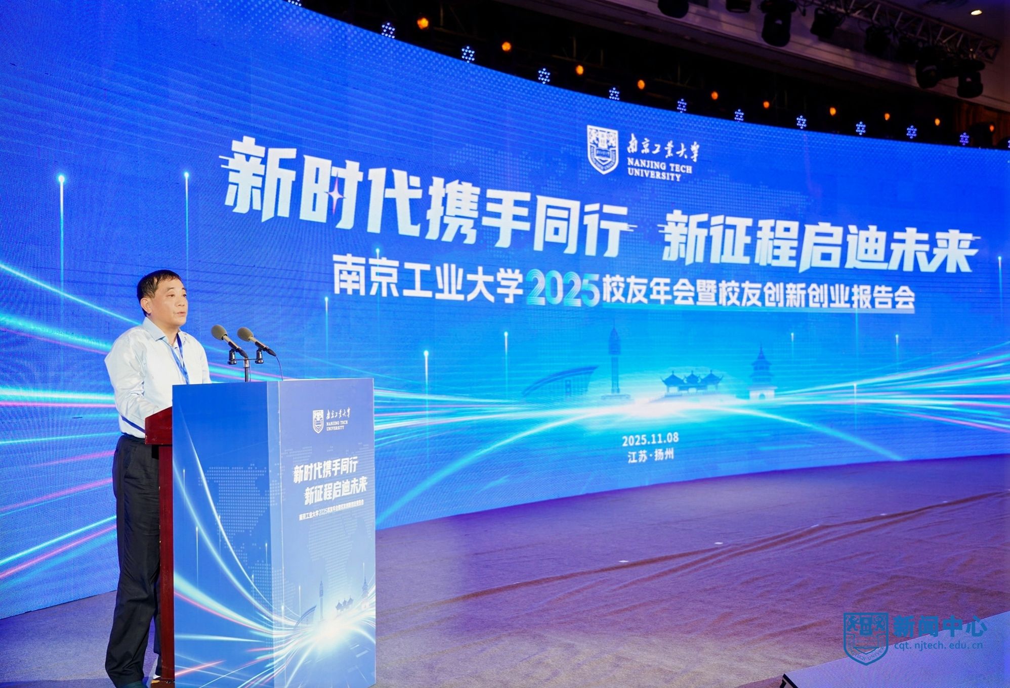 11月8日,2025校友年会暨校友创新创业报告会在扬州市举办。扬州市政府副市长刘流、市政协原副主席王骏、市科技局局长陈江伟,安徽建筑大学校长蔡国军,湖北城市建设职业技术学院原党委书记程超胜,校党委书记荆晅,校长蒋军成,副校长郭万牛、刘大卫、顾学红,原副校长巩建鸣等出席活动。副校长陆伟东主持会议。