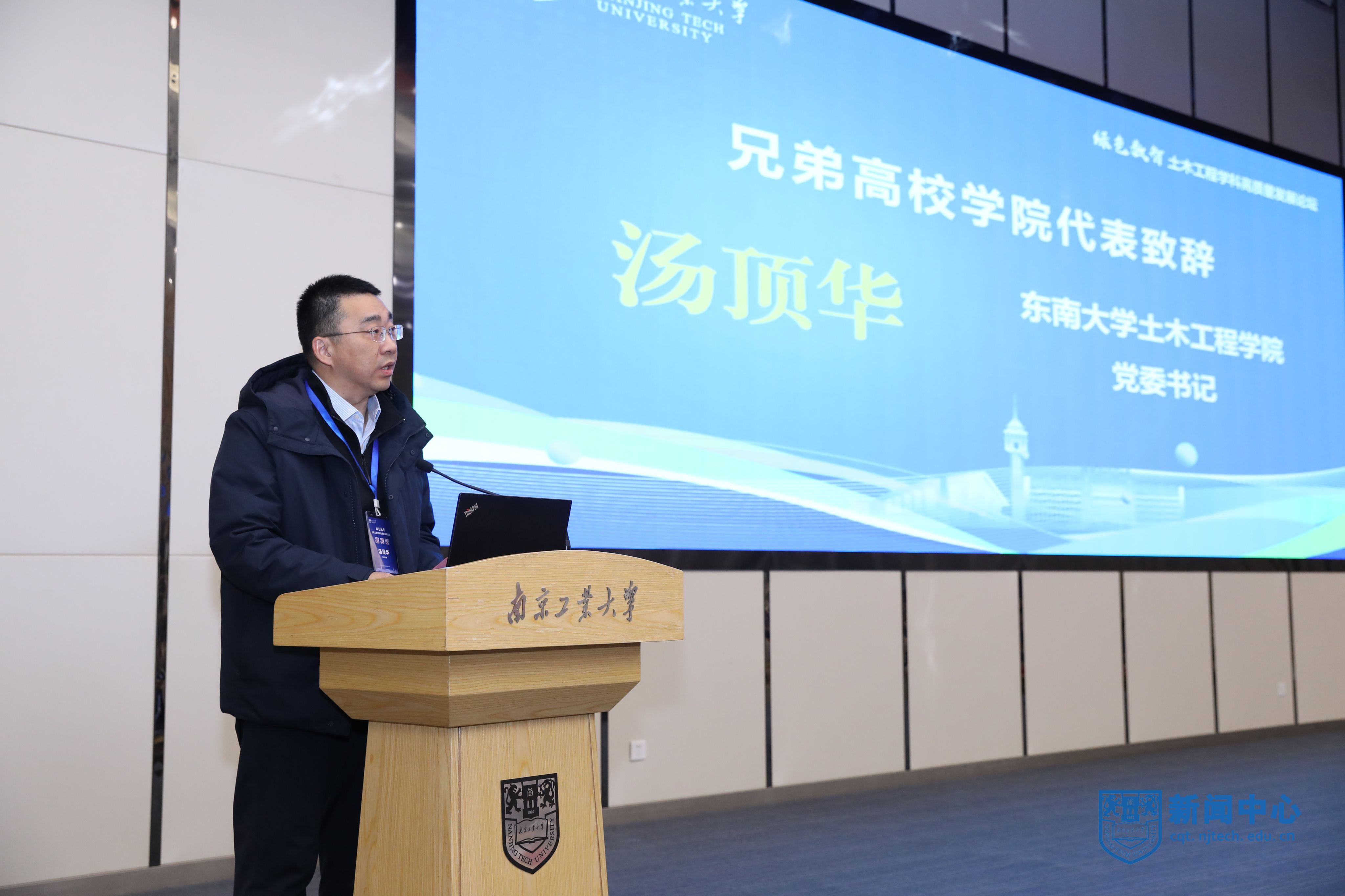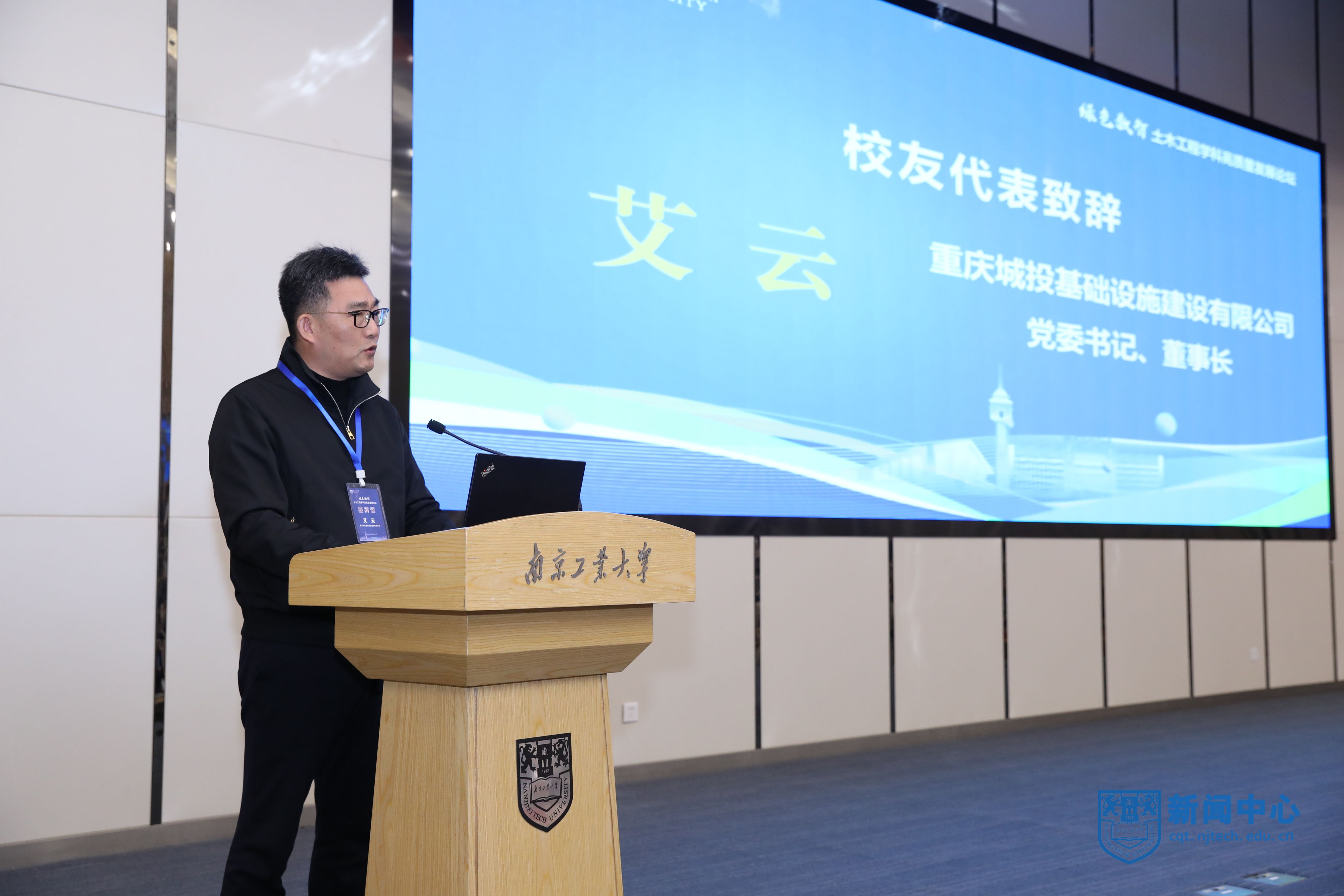 荆晅在致辞中回顾了学科办学历程与贡献,指出面对行业深刻变革,学科应聚焦服务国家战略、强化“人工智能+”引领、深化跨界融合,携手各界谱写高质量发展新篇章。吕西林院士追溯了同济大学与南京工业大学两校学科同根同源的历史,强调人才传承与紧密合作。杜修力院士祝贺学科成就,并期待深化协作,共担使命。土木工程学院院长方海作学科发展报告。校友代表吴红涛、重庆城投基础设施建设有限公司董事长艾云深情感恩母校培养,呼吁深化校企合作与产教融合。东南大学土木工程学院党委书记汤顶华作为兄弟高校代表,表达了延续深厚情谊、携手共进的美好愿望。