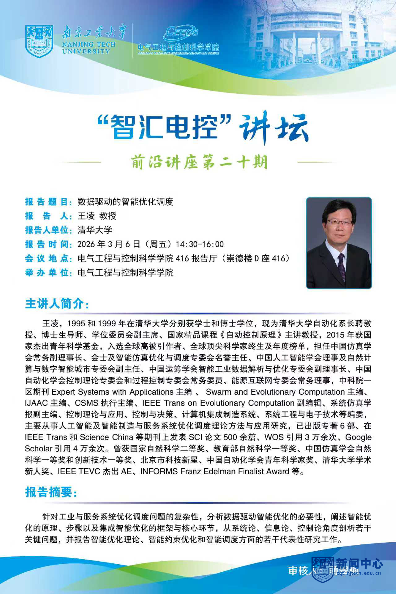 报告人简介:王凌,1995和1999年在清华大学分别获学士和博士学位,现为清华大学自动化系长聘教授、博士生导师、学位委员会副主席、国家精品课程《自动控制原理》主讲教授,2015年获国家杰出青年科学基金,入选全球高被引作者、全球顶尖科学家终生及年度榜单,担任中国仿真学会常务副理事长、会士及智能仿真优化与调度专委会名誉主任、中国人工智能学会理事及自然计算与数字智能城市专委会副主任、中国运筹学会智能工业数据解析与优化专委会副理事长、中国自动化学会控制理论专委会和过程控制专委会常务委员、能源互联网专委会常务理事,中科院一区期刊Expert Systems with Applications主编 、 Swarm and Evolutionary Computation主编、IJAAC主编、CSMS执行主编、IEEE Trans on Evolutionary Computation副编辑、系统仿真学报副主编、控制理论与应用、控制与决策、计算机集成制造系统、系统工程与电子技术等编委,主要从事人工智能及智能制造与服务系统优化调度理论方法与应用研究,已出版专著6部、在IEEE Trans和Science China等期刊上发表SCI论文500余篇、WOS引用3万余次、Google Scholar引用4万余次。曾获国家自然科学二等奖、教育部自然科学一等奖、中国仿真学会自然科学一等奖和创新技术一等奖、北京市科技新星、中国自动化学会青年科学家奖、清华大学学术新人奖、IEEE TEVC杰出AE、INFORMS Franz Edelman Finalist Award等。