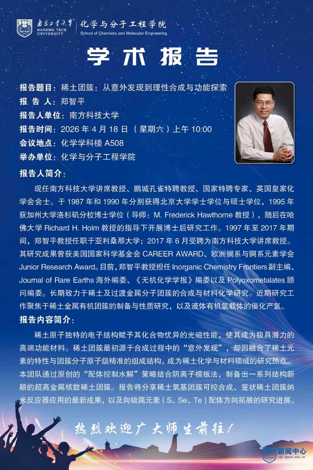 报告人简介:现任南方科技大学讲席教授、鹏城孔雀特聘教授、国家特聘专家、英国皇家化学会会士。于1987年和1990年分别获得北京大学学士学位与硕士学位,1995年获加州大学洛杉矶分校博士学位(导师:M. Frederick Hawthorne教授),随后在哈佛大学Richard H. Holm教授的指导下开展博士后研究工作。1997年至2017年期间,郑智平教授任职于亚利桑那大学;2017年6月受聘为南方科技大学讲席教授。其研究成果曾获美国国家科学基金会CAREER AWARD、欧洲镧系与锕系元素学会Junior Research Award。目前,郑智平教授担任Inorganic Chemistry Frontiers副主编、Journal of Rare Earths海外编委、《无机化学学报》编委以及Polyoxometalates顾问编委。长期致力于稀土及过渡金属分子团簇的合成与材料化学研究。近期研究工作聚焦于稀土金属有机团簇的制备与性质研究,以及液体有机氢载体的催化产氢。