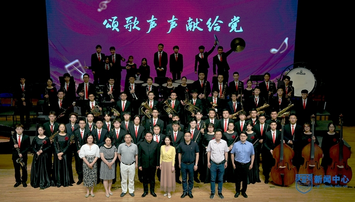 结业课以“颂歌声声献给党”为主题,由校团委文化艺术中心许鹏老师和马克思主义学院章景然老师主讲,校大学生艺术团交响管乐团的同学们用管乐倾情讲述党史故事,演绎党史中的经典旋律。《红旗颂》描绘了中国共产党团结带领中国人民实现一次又一次的伟大飞跃;《黄河大合唱(选段)》展现了全民族众志成城,以铮铮铁骨战强敌、前仆后继救危亡的史诗;《我的祖国》抒发了志愿军战士对新中国的捍卫与热爱;《春天的故事》展现了改革开放后中国大地焕发生机,发生翻天覆地的变化;《不忘初心》饱含党同人民的血肉联系与浓浓深情;《颂歌声声献给党》再现多首脍炙人口的经典音乐作品。演奏员代表、选修课程学生代表“反转课堂”,讲述参与系列课程的心得体会。最后在全场师生深情奏唱《没有共产党就没有新中国》的旋律中顺利结课。
